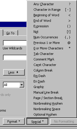 For most other special characters and objects, you can use the same codes as in simple searches (^l = manual line break, ^g = graphic, ^^ = caret ...). In many cases, characters can be addressed using their character numbers. The obvious example is ^13 for “paragraph”, as mentioned above. Unfortunately, this has not been implemented in a completely predictable or reliable manner, and if you have a need to search using character numbers, ensure that the search works with a test sample before committing to it. |