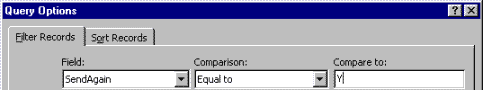 Re-sending a mailshot letter to several people (but not to the entire Data Source)Create a field (a column if you are using a Word or Excel Data Source) called “SendAgain”. Put a “Y” in that column against the rows you want the letter to be re-sent to. Save, switch back to Word, close the document and open it again to refresh it, and set up the Query Options dialog as follows: