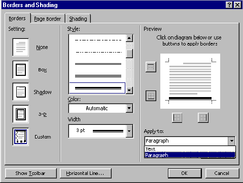 You can draw a line using the Line tool on the Drawing toolbar. If you hold down the Shift key while you are drawing it, it will be constrained to the horizontal or vertical. Although drawn lines can be rather labor-intensive, they can be useful for a form that will be filled out online and then printed because the “fill-in-the-blanks” lines are not affected by users' typing in answers. On the other hand, nor are cell borders, and they avoid all the “gotchas” associated with using floating objects. However, Drawing lines can be formatted even more flexibly than paragraph and table borders, since the line weight can be typed in (not just chosen from a list); and in the case of Word 97 there is a much greater range of colors (Word 2000 borders can be formatted in any color). The position of the line can be specified relative to the paragraph to which it is anchored; once you figure out the correct relation of your “fill-in-the-blanks” line to the answer you want to type into it, it's just a matter of formatting subsequent lines the same. (For example, for a line of 12-point text with 12 points of Space Before, a line position of 0.35" – 0.89cm – relative to the paragraph is just about right.)