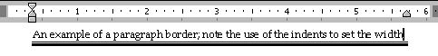 If the bordered paragraph is an “empty paragraph,” the result will be a blank line all the way across the page (the width can be adjusted by dragging the paragraph's left and/or right indent markers). Since a paragraph border can be formatted to have different weights (from 1/4 point to 6 points) and several different styles (even different colors), such “lines” can be very fancy indeed. This option can be used only when there will be no form text on the same line, as everything in the paragraph will be “underlined.”